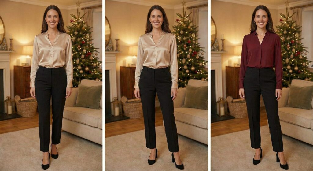 ✨ 4. Statement Tops + Tailored Pants (No Dress? No Problem)