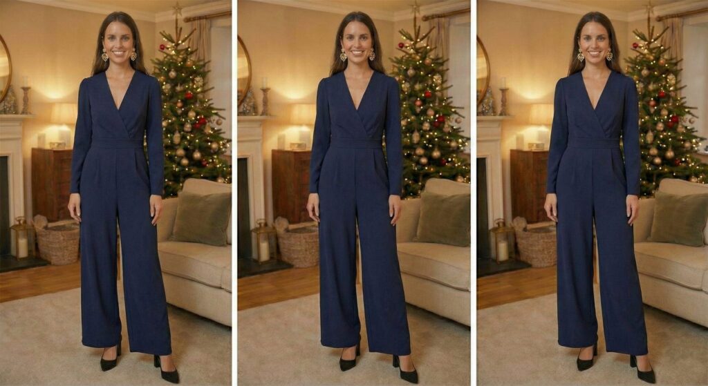A tailored jumpsuit in black, navy, or deep green gives instant polish without overthinking.