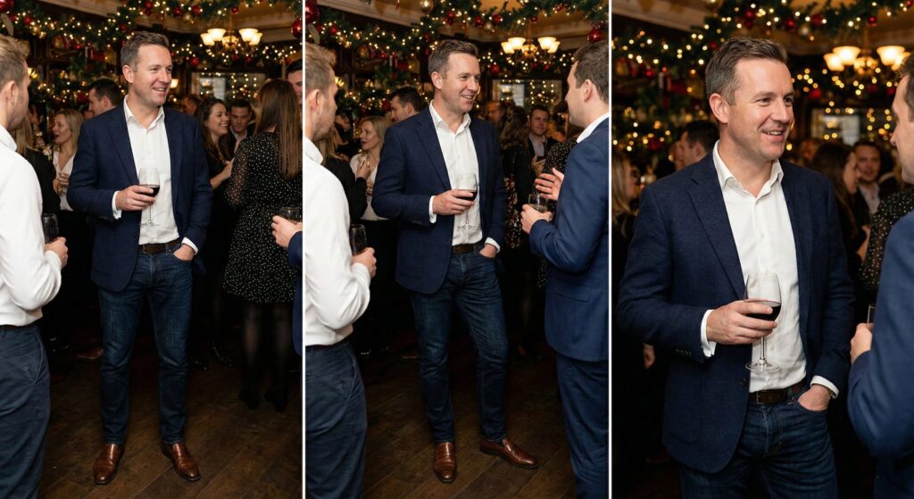 A blazer instantly upgrades any outfit. Throw on a navy or charcoal blazer over a simple shirt, pair it with dark jeans or chinos, and you’re good to go. It’s the kind of look that works perfectly for office parties or Christmas dinners where you want to look polished but not overdressed.